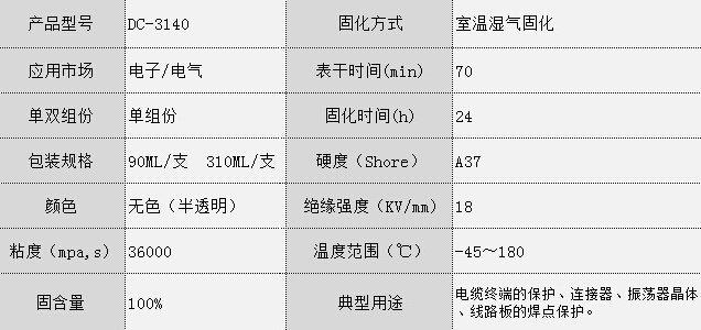 2.道康寧DC-3140 RTV 敷形涂料是一種清徹、半透明的材料,便于對被涂覆的元器件進(jìn)行目測識別、檢查和修復。它具有良好的耐磨性和堅韌性,適用于要求堅固耐用的應用場(chǎng)合。